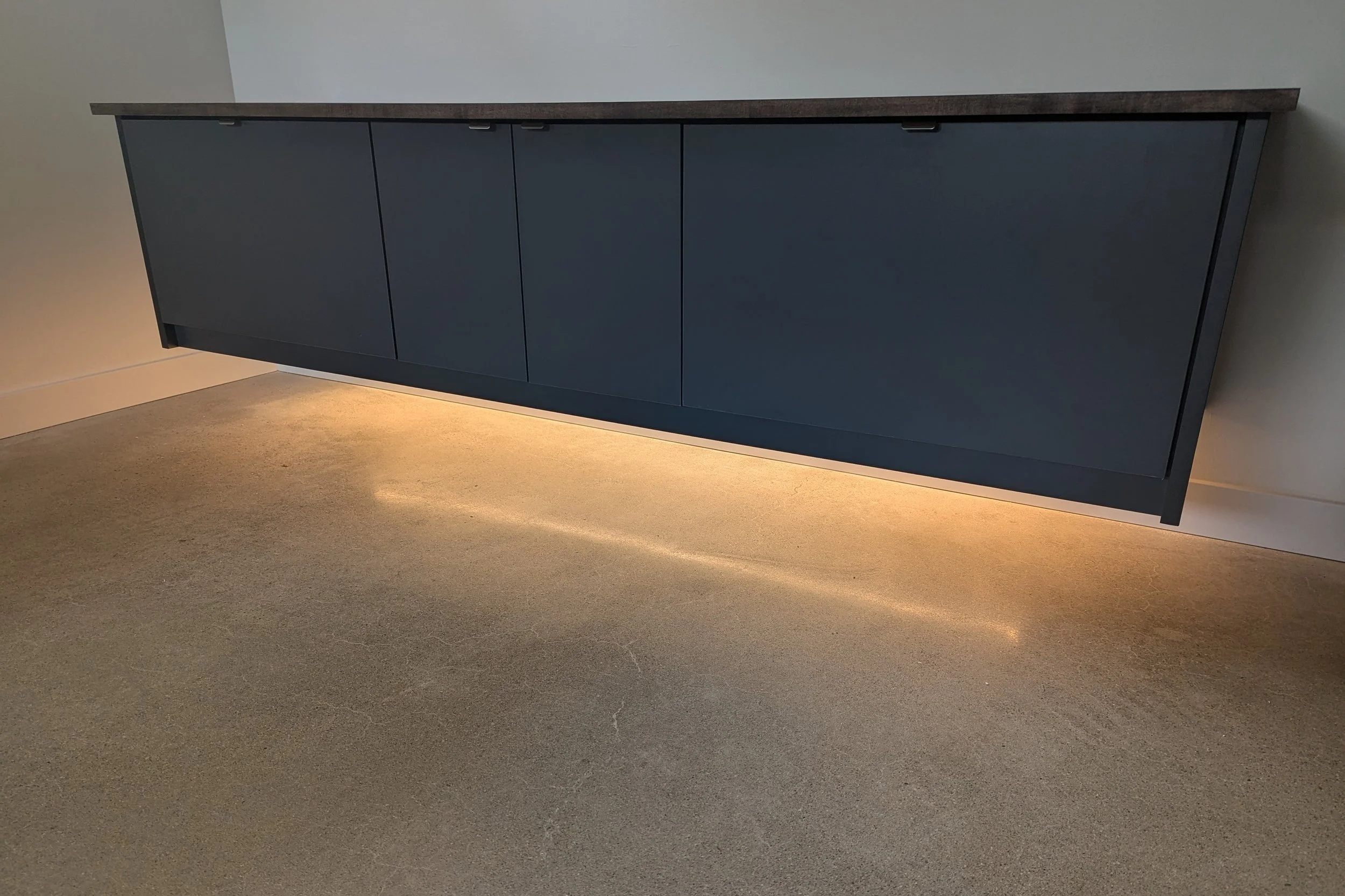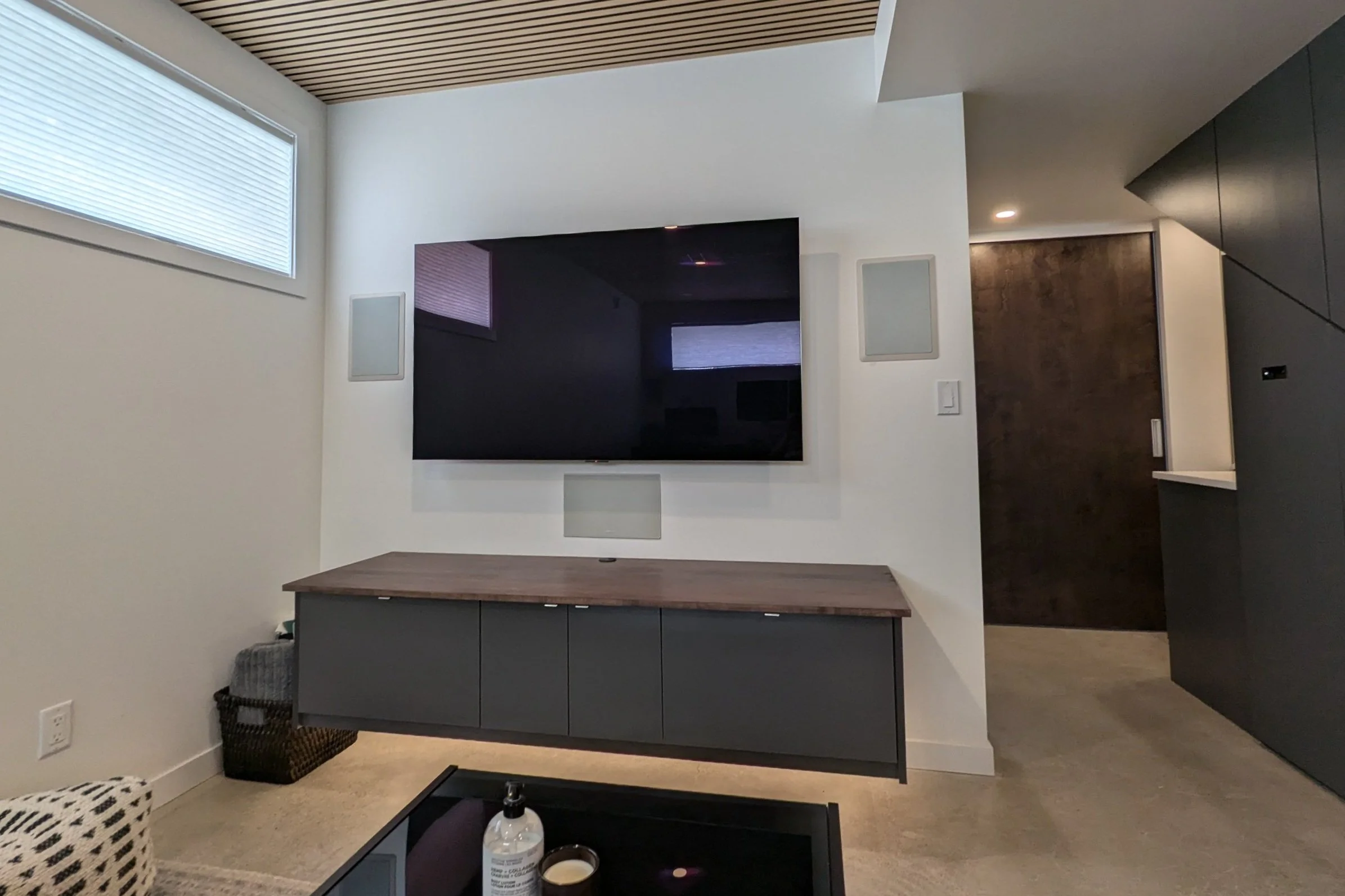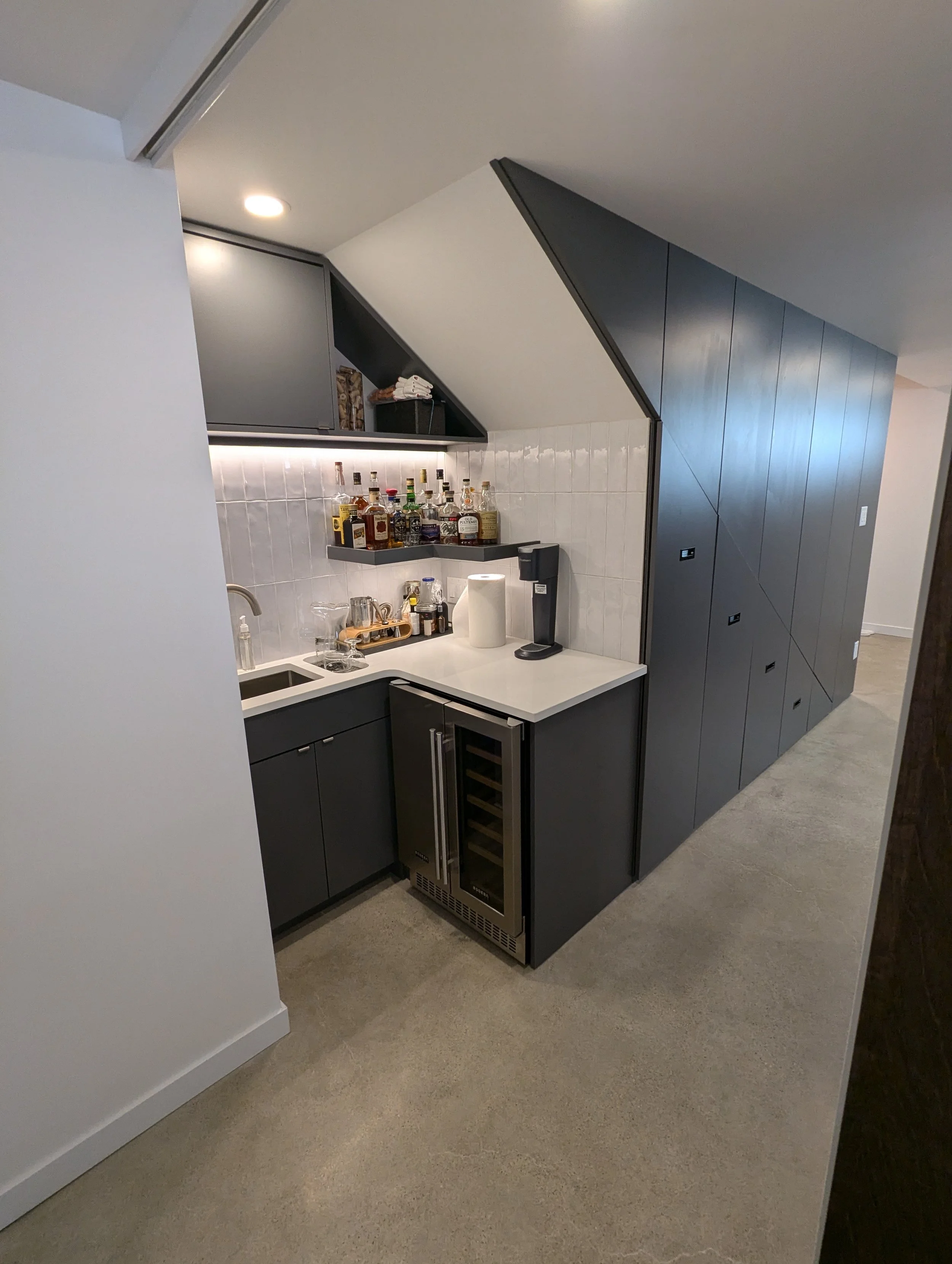 This basement renovation was done for a client who wanted a comfortable workspace and lounge area. We installed a custom acoustic wooden ceiling for their in-home sound studio, and a wet bar for entertaining.